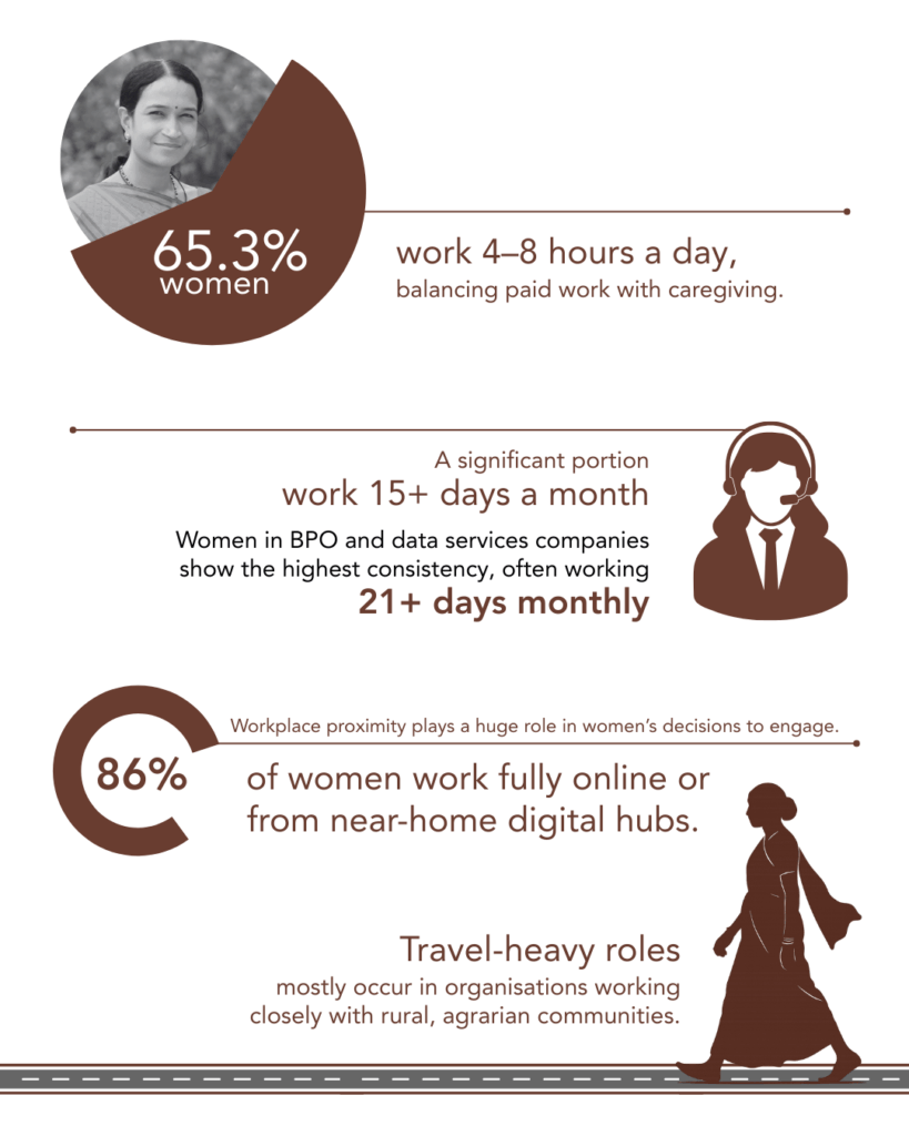 These insights come alive when seen through actual participation patterns. The data shared below illustrates the everyday realities of women in digital work—their hours, their consistency, and the vital role of proximity and safety in shaping their choices.