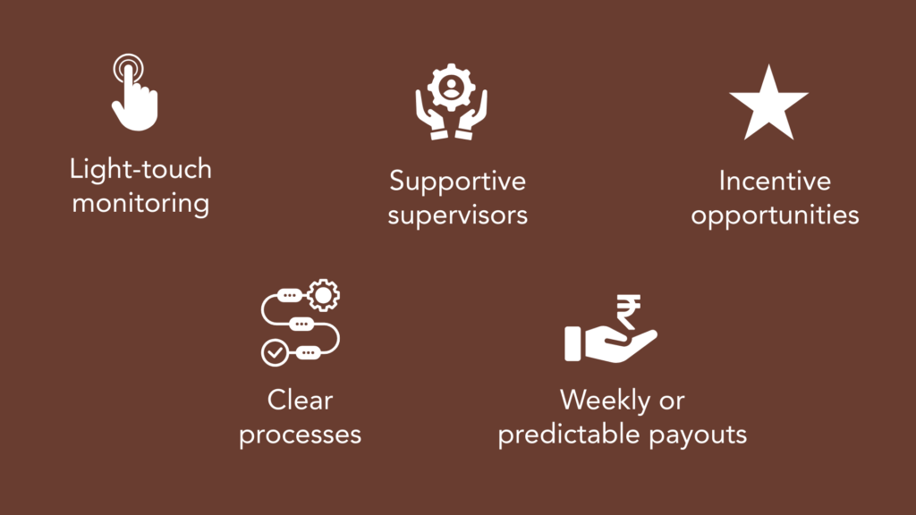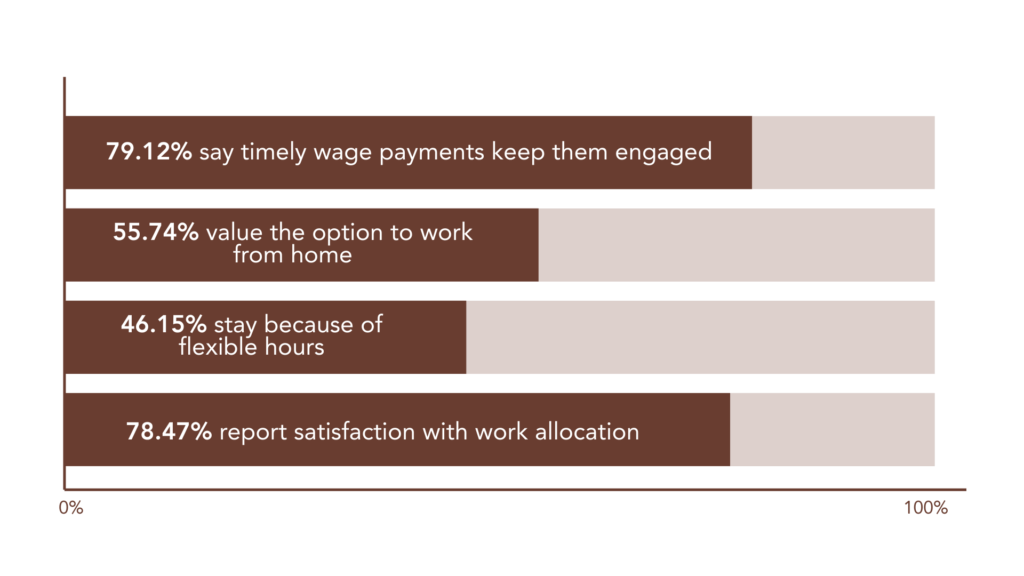 Once women enter the digital workforce, their decision to stay is strongly influenced by the conditions under which they work. Timely pay, fair work allocation, clear expectations, supportive managers, and a respectful culture shape their experience far more deeply than perks or incentives ever could.