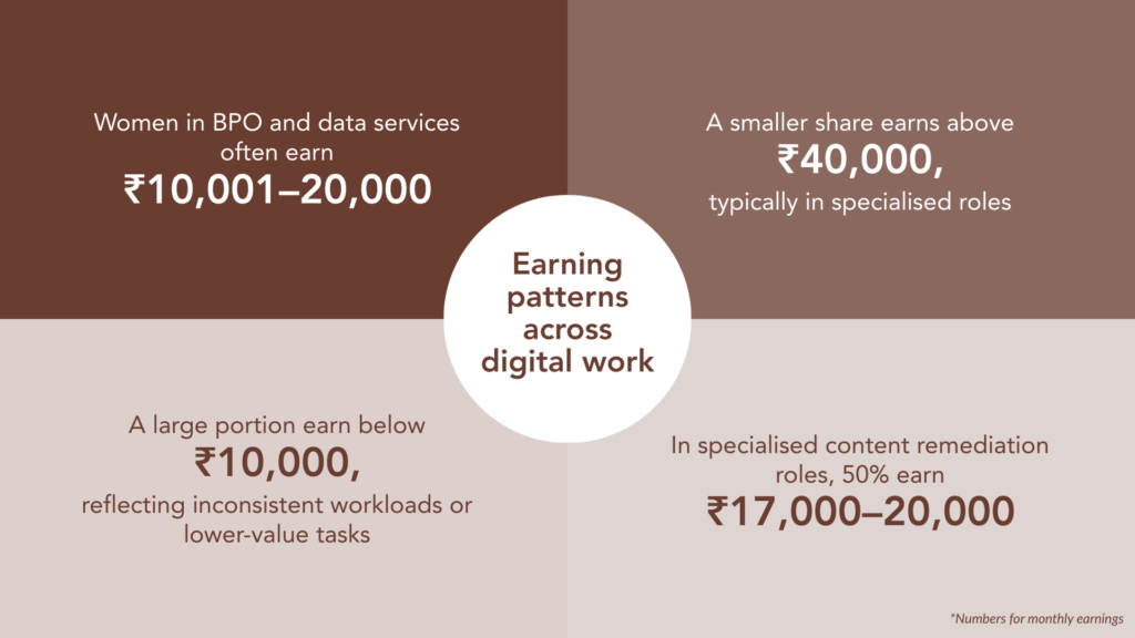 Women’s relationship with earnings is often shaped by responsibility, towards their families, their children’s aspirations, and their own long-delayed ambitions. While higher incomes are appreciated, what they emphasised most was the need for reliability.